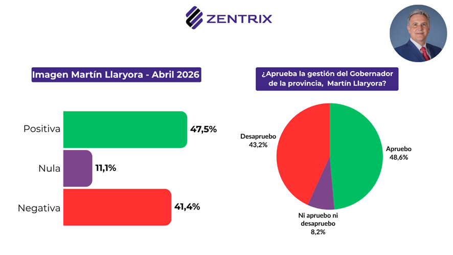 La imagen del gobernador Martín Llaryora muestra, en Córdoba, un desempeño más favorable que la del Gobierno nacional, tanto en términos de valoración personal como en la evaluación de su gestión. El 47,5% de los encuestados tiene una opinión positiva del mandatario provincial, mientras que el 41,4% expresa una valoración negativa, lo que arroja un saldo a favor de 6,1 puntos porcentuales. Esa diferencia también se replica en la evaluación de gestión: el 48,6% aprueba la administración provincial y el 43,2% la desaprueba, con un diferencial positivo de 5,4 puntos.