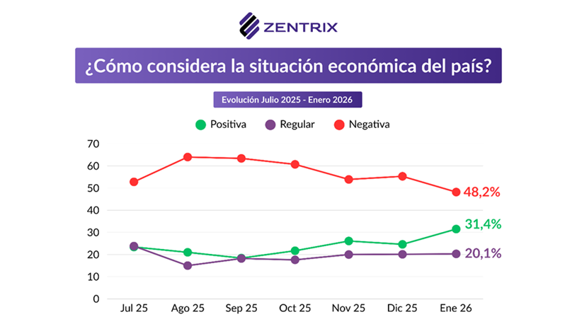 La mirada sobre la economía argentina sigue siendo mayoritariamente negativa, pero muestra un giro en el margen. En enero, el 48,2% de los encuestados califica la situación del país como “negativa”, mientras que el 31,4% la evalúa como “positiva” y el 20,1% la define como “regular”. Aun así, el informe marca que el humor económico empieza a moverse: el gráfico de evolución del MOP muestra que, respecto de mediciones anteriores, creció el porcentaje de quienes ven la economía con mejores ojos.