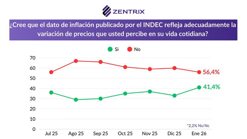En el mismo sentido, el relevamiento muestra que la inflación también se discute en el plano de la credibilidad: el 56,4% de los encuestados no cree que el dato del INDEC refleje lo que se vive en la calle, mientras que el 41,4% sí considera que el índice oficial se acerca a su percepción cotidiana. El informe agrega, además, que no se trata de una foto aislada: el gráfico de evolución del MOP exhibe cómo esta percepción fue moviéndose a lo largo de las mediciones, lo que refuerza la brecha entre estadística y experiencia diaria.
