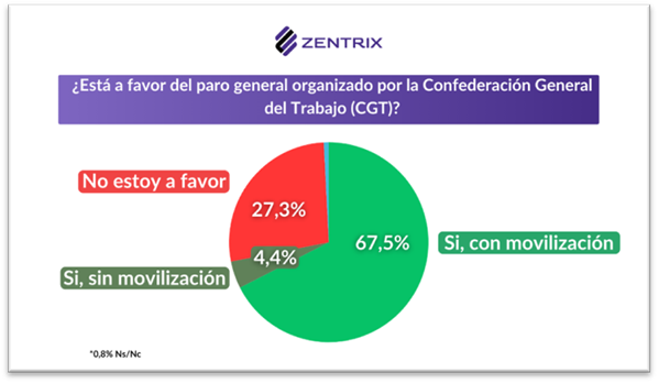 La encuesta preguntó de manera directa: “¿Está a favor del paro general organizado por la Confederación General del Trabajo (CGT)?”. El resultado muestra una mayoría clara y consistente de acompañamiento a la medida de fuerza. El 67,5% respondió que está a favor con movilización, mientras que un 4,4% apoyó la medida sin movilización. En conjunto, el 71,9% se manifestó favorable al paro. En contraposición, el 27,3% declaró no estar de acuerdo, y apenas el 0,8% no supo o no contestó.